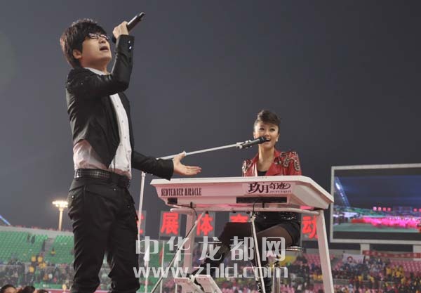 就在觀眾意猶未盡之時(shí),著名演唱組合“玖月奇跡”突然出現(xiàn)在表演場(chǎng)地上,引起觀眾一陣騷動(dòng)。“玖月奇跡”的女成員王小瑋在專用樂(lè)器“雙排鍵”上手腳并用,演奏出優(yōu)美樂(lè)曲的同時(shí),男歌手王小海飆起了高音,震驚全場(chǎng),把現(xiàn)場(chǎng)氣氛又一次推向高潮。