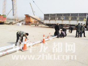 ?工人鋪設卸載瀝青的管道