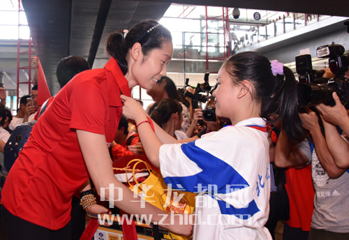 9月7日,一名學(xué)生在機場為載譽歸來的朱婷佩戴紅領(lǐng)巾。