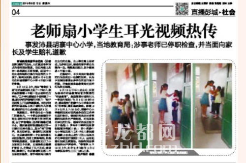 在等待調查結果的同時,記者通過網(wǎng)絡積極尋找與該視頻相關的信息。9月12日17時許,記者在當天的《彭城晚報》上看到一則標題為《老師扇小學生耳光視頻熱傳》的消息,報紙上刊登的圖片為視頻中的截圖。據(jù)報道,該事件發(fā)生在江蘇省徐州市沛縣胡寨中心小學。9月9日7時30許,胡寨中心小學老師吳某對沒有完成作業(yè)的3名學生進行體罰,后被人舉報。目前,涉事學校和老師已向家長和學生賠禮道歉。