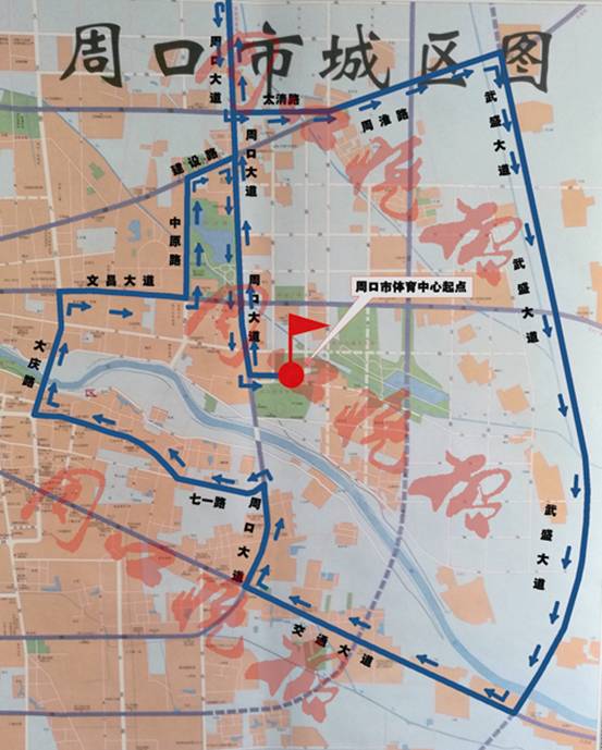 ????賽事初步確定報(bào)名參賽總?cè)藬?shù)為1萬(wàn)人,其中,全程馬拉松2000人,半程馬拉松2000人,迷你馬拉松6000人。比賽路線(xiàn)(如圖)暫定為:市體育中心(起點(diǎn))——周口大道——北高速口轉(zhuǎn)折——太清路——周淮路——武盛大道——周項(xiàng)路——周口大道——七一路——大慶路——文昌大道——中原路——建設(shè)路——周口大道——市體育中心(終點(diǎn))。