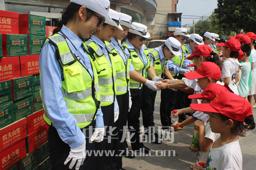 ????當(dāng)前,創(chuàng)建省級(jí)文明城市工作正在周口中心城區(qū)廣泛開(kāi)展,整個(gè)城市越來(lái)越干凈美麗,城市文明程度不斷提升。8月15日上午,在八一大道和七一路交叉口,團(tuán)市委組織數(shù)十名志愿者和孩子協(xié)助交警維護(hù)交通秩序??吹浇痪⒁虩岬煤沽鳑驯常⒆觽兗娂妼⒌V泉水送到她們手中。晚報(bào)記者 王凱 攝