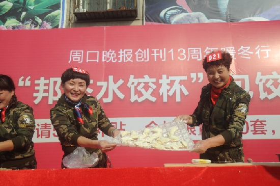 ????12月4日,周口晚報(bào)創(chuàng)刊13周年暖冬行大型公益活動(dòng)——包餃子大賽啟動(dòng)第一場(chǎng)分站賽,69組138名選手激烈角逐后,6組選手獲得分站賽一、二、三等獎(jiǎng)。晚報(bào)記者 朱海龍 攝