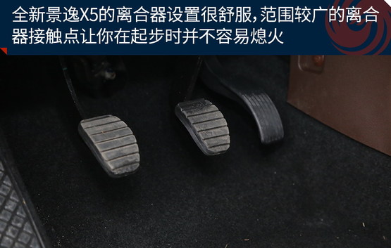 對于手動擋車型而言,除了變速器本身外,還有一個部件十分重要那就是離合器,一個調整的十分舒適的離合器可以給駕駛者帶來更好的駕駛感受。全新景逸X5的離合器設置很舒服,雖然從腳感來說,它的離合器設定有些偏沉,但不要擔心,范圍較廣的離合器接觸點讓你在起步時并不容易熄火。