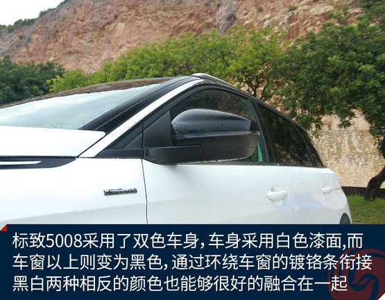 標(biāo)致5008采用了雙色車身,比如我們試駕的這一輛GT-Line版車型,車身整體采用白色漆面,而車窗以上的部分則變?yōu)楹谏ㄟ^環(huán)繞車窗的鍍鉻條銜接,黑白兩種相反的顏色也能夠很好的融合在一起。