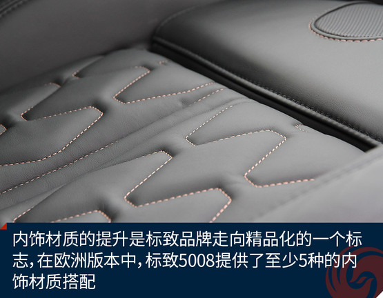內(nèi)飾材質(zhì)的提升是標(biāo)致品牌走向精品化的一個標(biāo)志,在歐洲版本中,標(biāo)致5008提供了至少5種的內(nèi)飾材質(zhì)搭配,比如我們試駕的這款GT-Line版本,就采用布與皮相結(jié)合的材質(zhì)選擇,座椅則采用了標(biāo)致最新的經(jīng)典紋路,既美觀又保證乘坐舒適性。