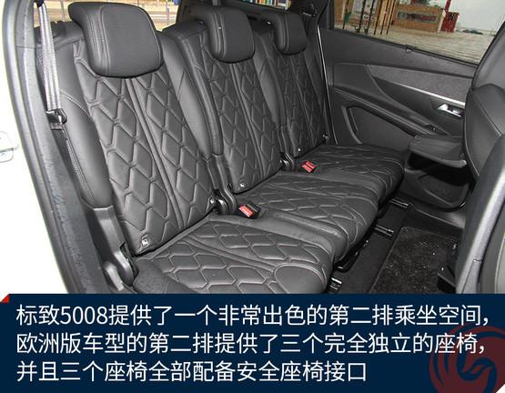 作為一款7座中型SUV,標(biāo)致5008最受關(guān)注的一點就是車內(nèi)空間的體驗了,這里我就來多講一講。首先,標(biāo)致5008提供了一個非常出色的第二排乘坐空間,不夸張的說2840毫米的軸距基本上就是在為第二排乘客服務(wù)的。歐洲版車型的第二排提供了三個完全獨立的座椅,并且三個座椅全部配備安全座椅接口,而國產(chǎn)車型將會改為4/6分隔的座椅類型。
