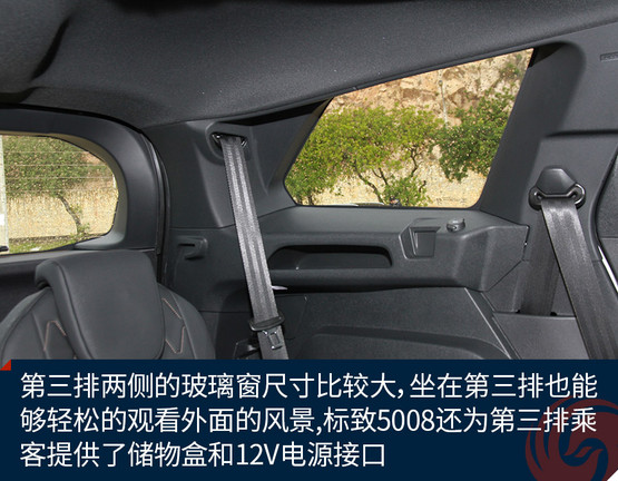 不過第三排也有值得表揚的地方,首先正如前面所說,由于車身設(shè)計的比較方正,所以第三排的頭部空間比較理想,并不覺得特別頂頭;另外,第三排兩側(cè)的玻璃窗尺寸比較大,坐在第三排也能夠輕松的觀看外面的風(fēng)景;最后,標(biāo)致5008還為第三排乘客提供了儲物盒和12V電源接口,能夠滿足基本的使用需求。