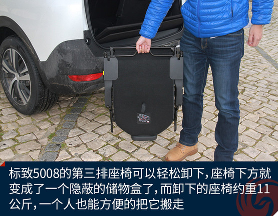 此處還有一個小Tips:標(biāo)致5008的第三排座椅可以輕松卸下,座椅下方就變成了一個隱蔽的儲物盒了,而卸下的座椅約重11公斤,一個人也能方便的把它搬走。
