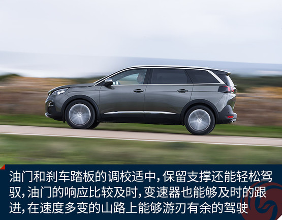 油門和剎車踏板的調(diào)校也如是,踏板腳感適中,保留支撐還能輕松駕馭,并不像多數(shù)歐系車那樣沉重。油門的響應(yīng)比較及時,變速器也能夠及時的跟進,在速度多變的山路上能夠游刃有余的駕駛。唯一的問題是低功率的1.6T在動力上沒有突出的表現(xiàn),尤其在上坡時,加速會稍感吃力,但是想到這事一款家用SUV,這也就不是問題了。而且標(biāo)致5008在國內(nèi)的主力車型將會是1.8T版本,動力還會再上一個臺階。