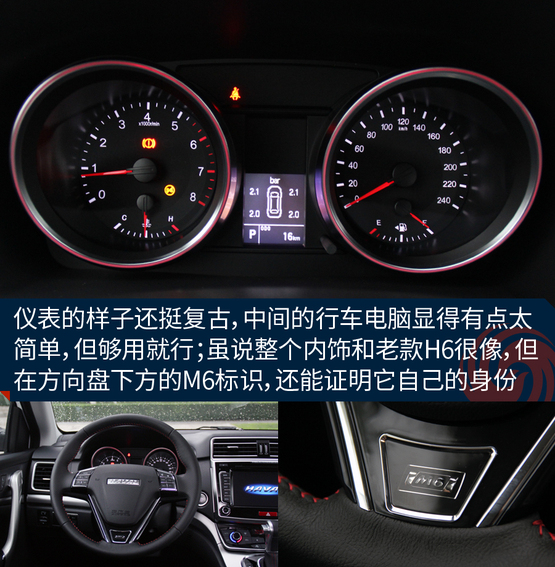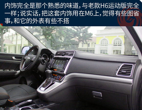 ????????車上的機(jī)械液壓助力轉(zhuǎn)向的力度有點沉,這點和老款H6特別的相似,長時間在低速行駛或者移庫挪車的時候挺廢胳膊,大老爺們長時間開都覺得酸,更何況瘦小的小女孩呢!所以從這點看出,M6會從配置以及更低的價格來吸引消費者,至于想這些其他的問題,大伙就別太吹毛求疵了,畢竟魚和熊掌不可兼得。