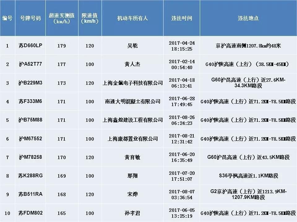 ????中青在線上海9月12日電(中國青年報 中青在線記者 王燁捷)上海交警今天公布今年以來“前五十”機(jī)動車超速違法名單,最高時速竟達(dá)179km/h。