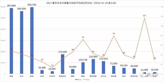 銷售的數(shù)量固然重要,但是銷售質(zhì)量也是評(píng)估銷售力不能忽視的重要指標(biāo)。衡量銷售質(zhì)量,“加權(quán)平均成交價(jià)”和“單車?yán)麧?rùn)”這兩個(gè)重要參數(shù),也許讓我們更直觀的看到車企的銷售能力與經(jīng)銷商單店經(jīng)營(yíng)質(zhì)量。這些更微觀的數(shù)據(jù)往往更能反映銷售公司及其經(jīng)銷商體系的銷售能力及水平?!凹訖?quán)平均成交價(jià)”反映車企的產(chǎn)品力與銷售公司的銷售能力,車企賣(mài)掉的車越多,單車價(jià)格越貴,品牌就越具有競(jìng)爭(zhēng)力,反之就需要考慮改進(jìn)產(chǎn)品,提升銷售管理能力。“單車?yán)麧?rùn)”指經(jīng)銷商銷售新車獲取的利潤(rùn),不含衍生利潤(rùn),一般在-4%-7%之間,如果單車?yán)麧?rùn)超過(guò)-2%,廠家需要考慮對(duì)經(jīng)銷商進(jìn)行補(bǔ)貼,如果利潤(rùn)超過(guò)7%,車企就會(huì)調(diào)整經(jīng)銷商浮動(dòng)返利。下面我們通過(guò)這兩個(gè)指標(biāo),來(lái)看哪些豪華車品牌在2017年表現(xiàn)更具實(shí)力。