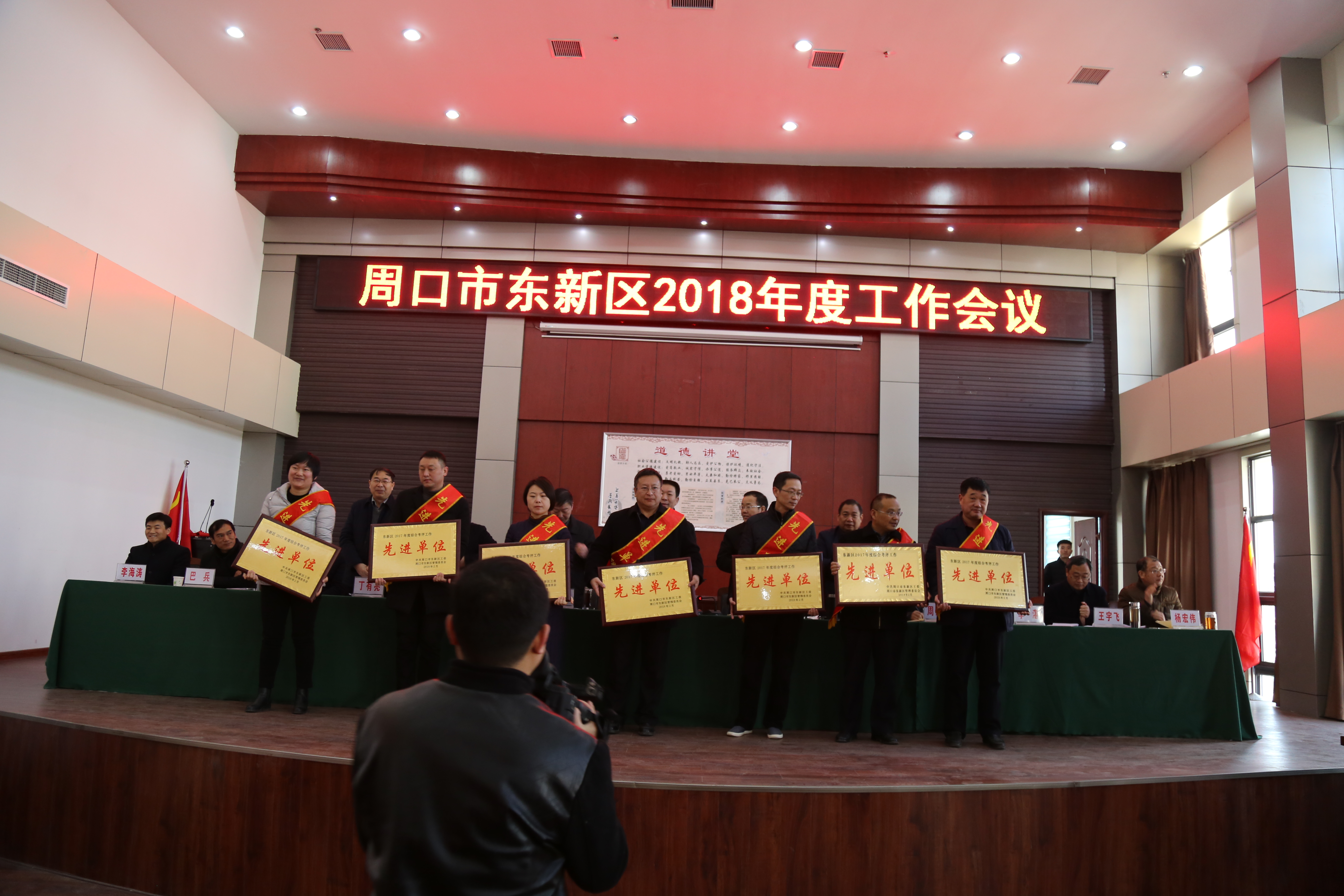 中華龍都網(wǎng)訊(周口報(bào)業(yè)全媒體記者 張勁松 通訊員 蘇千)適應(yīng)新時(shí)代 聚焦新目標(biāo) 落實(shí)新部署。2月3日,東新區(qū)2018年度工作會(huì)議在該區(qū)商務(wù)中心區(qū)會(huì)議室隆重召開(kāi)。區(qū)機(jī)關(guān)副科級(jí)以上干部、各鄉(xiāng)(辦)班子成員、行政村(社區(qū))支部書(shū)記、受表彰人員及單位代表等160余人參加會(huì)議。東新區(qū)黨工委書(shū)記閆立超、管委會(huì)主任張建黨及全體班子成員出席會(huì)議,東新區(qū)紀(jì)委書(shū)記韓華主持會(huì)議。