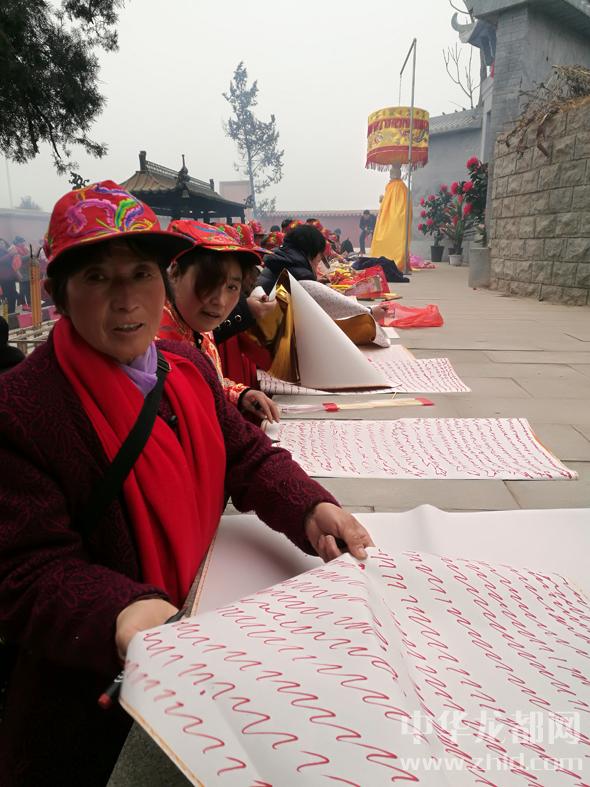 大霧的確延緩了香客的腳步,這也讓晚來的記者得以看到祭拜的盛景。女媧陵前,十幾名身著統(tǒng)一緞面紅襖,穿黑棉布鞋的女客正在結(jié)伴焚香祭拜,口音明顯和當(dāng)?shù)厝瞬煌?。她們是從距西華300多公里的濮陽范縣、臺前縣來的,說是凌晨2時(shí)就起身出發(fā),大霧中不僅遭遇堵車,還迷了路,到女媧城都快8時(shí)了。她們這次一起來的有30多人,分乘4輛車。就像往常前來一樣,她們在女媧城要焚香、跪拜、“寫賬”(在紙上畫符,敬奉女媧的一種民間形式)、“守功”(在大殿靜坐,以示對女媧親近),直至下午方回。“我們每年六月初一和臘月初一都來,為啥?信奉女媧娘娘唄,不來不舒服?!逼渲幸晃豢仔障憧透嬖V記者。