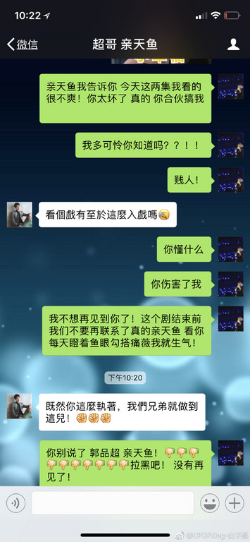 黃子韜12日在微博上分享一張與郭品超的對(duì)話(huà)截圖,并在發(fā)文中生氣地寫(xiě)道:“什么都不用說(shuō)了!拉黑吧!”他似乎是在看了最新播出的2集《談判官》后,為自己劇中的遭遇感到憤憤不平,立刻找郭品超算賬直呼:“親天魚(yú)(秦天宇,郭品超劇中角色)我告訴你,今天這兩集我看的很不爽!你太壞了,真的,你合伙搞我。我多可憐你知道嗎?!賤人!”