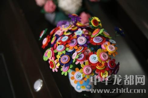 圖為3月12日,項(xiàng)城市特殊教育學(xué)校的孩子用扣子和針線做好的手工花卉,十分漂亮。