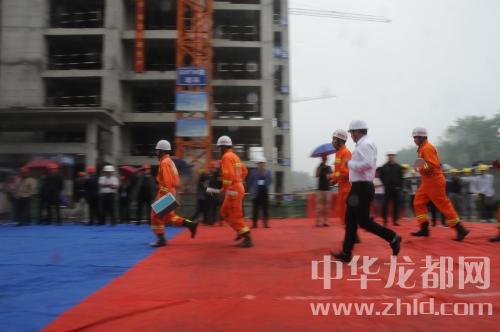 中華龍都網訊(周口報業(yè)全媒體記者 朱海龍)5月11日上午,在商水縣建業(yè)城項目施工工地,商水縣舉辦建筑施工現場應急救援演練,200多人冒雨觀摩現場演練。