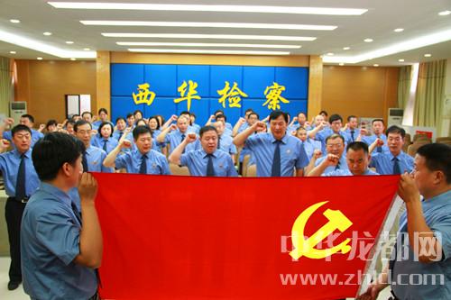中華龍都網(wǎng)訊(周口報(bào)業(yè)全媒體記者 竇娜 通訊員 屈琳琳)“我志愿加入中國共產(chǎn)黨,擁護(hù)黨的綱領(lǐng),遵守黨的章程,履行黨員義務(wù),執(zhí)行黨的決定……”6月28日,面對鮮紅的黨旗,西華縣人民檢察院副檢察長、黨支部書記劉新建帶領(lǐng)全體黨員高舉右手,重溫入黨誓詞。