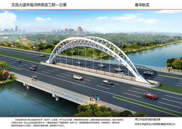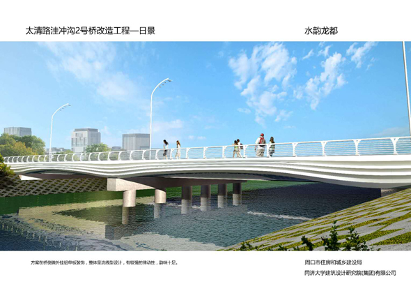 周口大道沙潁河橋景觀改造,設(shè)計(jì)造型簡單柔美,如行云流水,同時(shí)與沙潁河景觀帶相融合,給城市增添了生機(jī)與活力。周口大道賈東干渠橋以荷葉為設(shè)計(jì)元素,造型簡約而不失細(xì)節(jié)。周口大道流沙河橋造型簡潔大氣,線條流暢,像一條青龍游弋在水面上。文昌大道幸福河橋以花瓣、葉子為設(shè)計(jì)元素,造型豐富多彩。文昌大道流沙河故道橋在中分帶位置修建花壇,花壇造型莊重古樸,景石造型端莊沉穩(wěn)。太清路流沙河橋以古建斗拱、窗花為元素,造型儒雅大方。太清路洼沖溝2號橋以“輻轂相依”為名,既融合環(huán)境,又有團(tuán)結(jié)、合作的寓意。太清路賈魯河橋,增加了景觀造型,使人們可以重溫當(dāng)年賈魯河的美好畫卷。彭新莊橋以柳葉為元素,預(yù)示著留住賓客與送別親友的不舍之情的雙重含義。