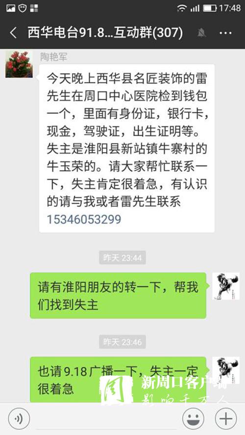 很快,一條尋找失主的愛心信息,便通過無線網(wǎng)絡(luò),乘著夜色翅膀,在豫東大地的西華縣政協(xié)群、西華縣非公黨工委群、西華縣城市管理群、西華縣愛心粥屋群、西華電臺(tái)91.8互動(dòng)群、周口市個(gè)私協(xié)會(huì)系統(tǒng)群、淮陽(yáng)縣非公黨工委群、淮陽(yáng)縣文明辦群、淮陽(yáng)縣城市管理群等微信群迅速散發(fā)開來。很多群友進(jìn)行轉(zhuǎn)發(fā)、點(diǎn)贊。