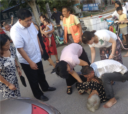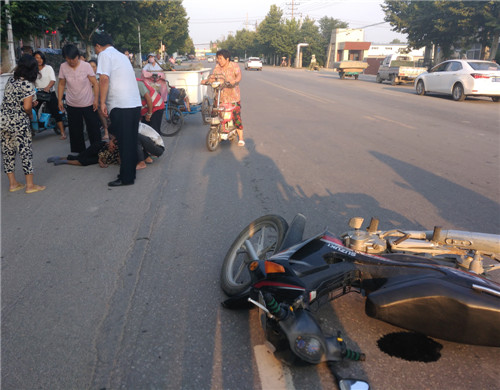 當(dāng)日6時許,趙紅建在寧平鎮(zhèn)扶貧返回縣城行駛至金丹大道工業(yè)區(qū)段時,發(fā)現(xiàn)一輛摩托車倒在馬路中間,一位老人躺臥車邊,目測老人胳膊、腿部傷情較重。