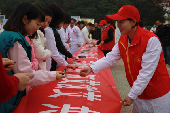 圖為在趕來參加活動(dòng)的群眾和醫(yī)護(hù)人員共同在預(yù)防艾滋病百米長卷上簽名。