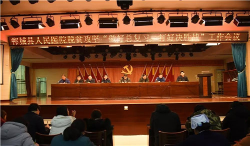 2月15日下午,鄲城縣人民醫(yī)院在門診五樓召開脫貧攻堅“做好總復(fù)習(xí),打好決勝戰(zhàn)”工作會議,傳達(dá)落實(shí)縣衛(wèi)計委扶貧工作會議精神,部署脫貧攻堅工作。鄲城縣人民醫(yī)院院長于健偕全體院領(lǐng)導(dǎo)班子出席會議,院黨委書記高飛主持。健康扶貧辦、醫(yī)保、財務(wù)、宣教、醫(yī)政、護(hù)理、藥事、醫(yī)療裝備等肩負(fù)健康扶貧任務(wù)的職能科室負(fù)責(zé)人、全體護(hù)士長、3個幫扶村扶貧隊長及全體扶貧隊員200余人參加會議。