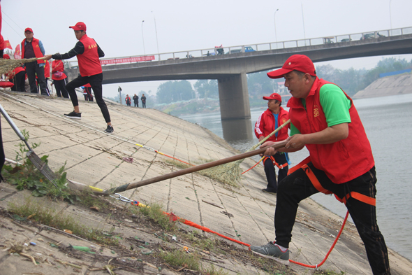當(dāng)天上午,志愿者拿著掃帚、鐵锨等工具,對堤坡的塑料袋、礦泉水瓶等垃圾進行清理,還有一些志愿者負責(zé)清理河堤上的垃圾。雖然垃圾雜物又臟又臭,但是志愿者相互協(xié)作,干得熱火朝天。