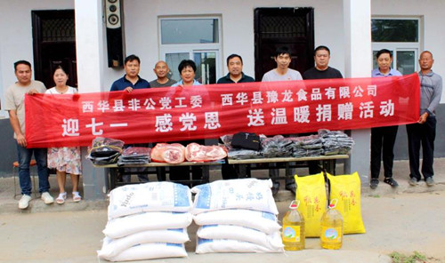 5月28日,西華縣非公黨工委聯(lián)合愛心企業(yè)開展“迎七一、感黨恩、送溫暖”捐贈活動,西華縣非公黨工委書記李永民帶領非公黨工委工作人員、西華縣豫龍食品有限公司經理李會霞,以及部分非公企業(yè)黨支部書記,為黃橋鄉(xiāng)敬老院送去了價值5000余元的衣服、豬肉、面粉、米、食用油等物品。