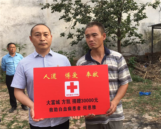 西華縣副縣長張翠霞、西華縣紅十字會秘書長趙紅霞等人聞訊趕來,參加簡短的捐款儀式,并代表縣政府和紅十字會對方凱的善舉表示感謝。