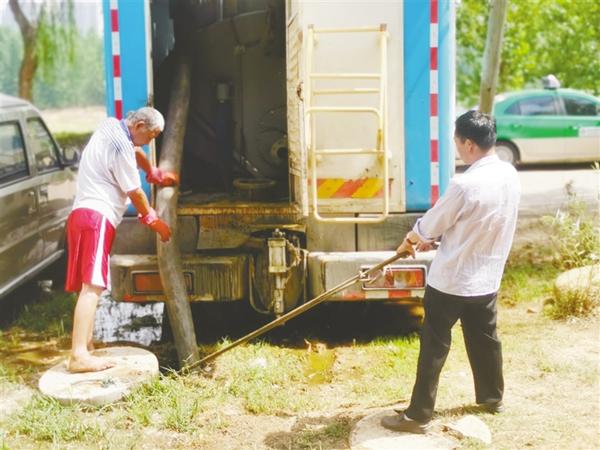 站在公廁旁的污水邊,該負(fù)責(zé)人指揮專門處理糞液的車輛到達(dá)現(xiàn)場,并就該公廁的情況向記者進(jìn)行說明?!斑@個公廁是由市園林處負(fù)責(zé)修建的,建好投入使用的時(shí)候就沒有鋪設(shè)污水管道,只配套了一個能容納9立方米污水的化糞池。因?yàn)楦浇行V場,健身的市民多,公廁使用的頻率高,一個化糞池不夠用,我們又增加了一個能夠容納10立方米污水的化糞池,定期進(jìn)行清理?!痹撠?fù)責(zé)人說。