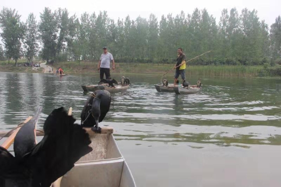 悄悄地,漁船輕移,飄至河心。船家一聲令下,鸕鶿箭一般竄入河中,或撲棱翅膀,搏擊水面,或緊追游魚(yú),銜進(jìn)口中。采風(fēng)團(tuán)成員,緊盯鸕鶿銜魚(yú),快按鏡頭,收獲一張張豐收畫(huà)面。
