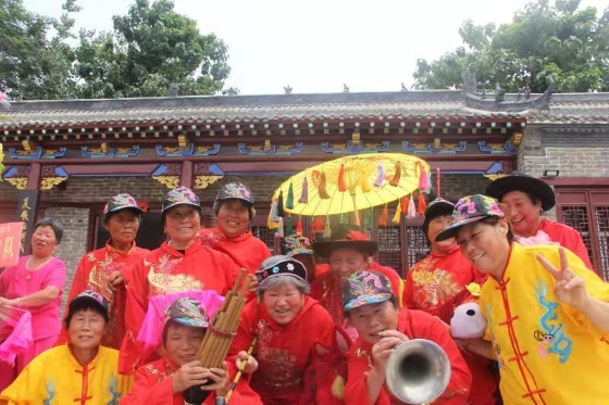 歡快的音樂(lè)響起,一群群老人們載歌載舞,翩翩而來(lái)。她們有的劃著旱船,有的揮著鞭子,有的叼著煙斗,有的抬著轎子,一招一式,都是那么專業(yè)。