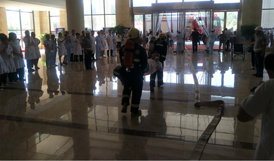 此次演練模擬一個蒙面歹徒在該縣六樓某科室打砸并故意縱火,轄區(qū)公安干警、消防指戰(zhàn)員及醫(yī)院保安力量迅速出動處置,防恐人員及時將犯罪分子制服,而此時醫(yī)院內(nèi)火災(zāi)迅速蔓延,多名醫(yī)護人員被困火場無法逃生,醫(yī)院負責(zé)人通過應(yīng)急廣播進行人員疏散,消防指戰(zhàn)員按照預(yù)定應(yīng)急處置方案迅速展開滅火救援行動。