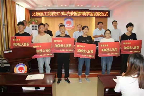 焦陽光同志宣讀了太康縣工商聯(lián)《關于表彰2019年度“精準扶貧˙光彩圓夢”助學活動中先進單位及個人的決定》。授予河南通泰紡織有限公司等19家企業(yè)為2019年度“精準扶貧˙光彩圓夢”助學活動“愛心企業(yè)”榮譽稱號,授予太康縣鑫源鞋業(yè)有限公司薛華杰等45名同志為2019年度“精準扶貧˙光彩圓夢”助學活動“愛心人士”榮譽稱號。張珍珍代表學生發(fā)言。四通鍋爐董事長馮坤代表企業(yè)表示,只要有困難,四通鍋爐將不遺余力的進行幫助,直到完成學業(yè)。