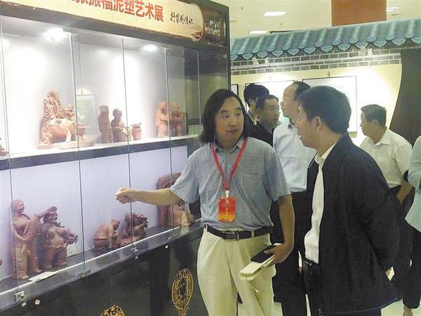 9月13日上午,2019年中國(鄭州)中秋文化節(jié)、中國農(nóng)民豐收節(jié)、國慶節(jié)“三節(jié)聯(lián)動(dòng)”系列傳統(tǒng)文化活動(dòng)在鄭州綠博園啟動(dòng)。鄲城縣泥塑藝人張振福受邀攜帶300多件泥塑作品參展,為活動(dòng)帶去了濃濃的鄉(xiāng)土味兒。圖為張振福正在向參觀群眾介紹作品。