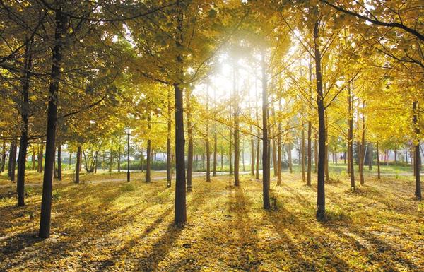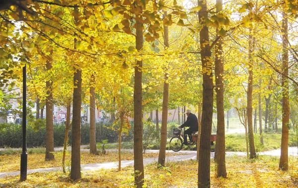 近日,周口市經濟開發(fā)區(qū)人民廣場,金黃色的楊樹葉在陽光照耀下熠熠生輝,給城市增添一抹亮色。張振海 攝