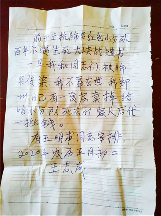 初二晚上,他是邊哭邊寫下遺書。他說,病毒傳染,看不見摸不著,也不知道誰攜帶?更不知道明天大家是個什么情況,既然動員大家沖到抗疫一線,戰(zhàn)死了,他的家人咋辦?他說,他在鄭州有一處房產(chǎn)是養(yǎng)老用的,他害怕自己不幸感染去世了,沒人照顧小分隊?wèi)?zhàn)死的家人生活,隨寫下遺書,如果出現(xiàn)這種情況,將他的房產(chǎn)賣掉,分給抗疫戰(zhàn)死的隊員家人。