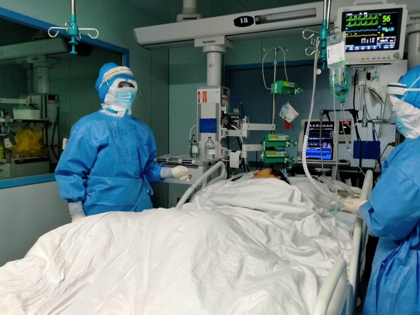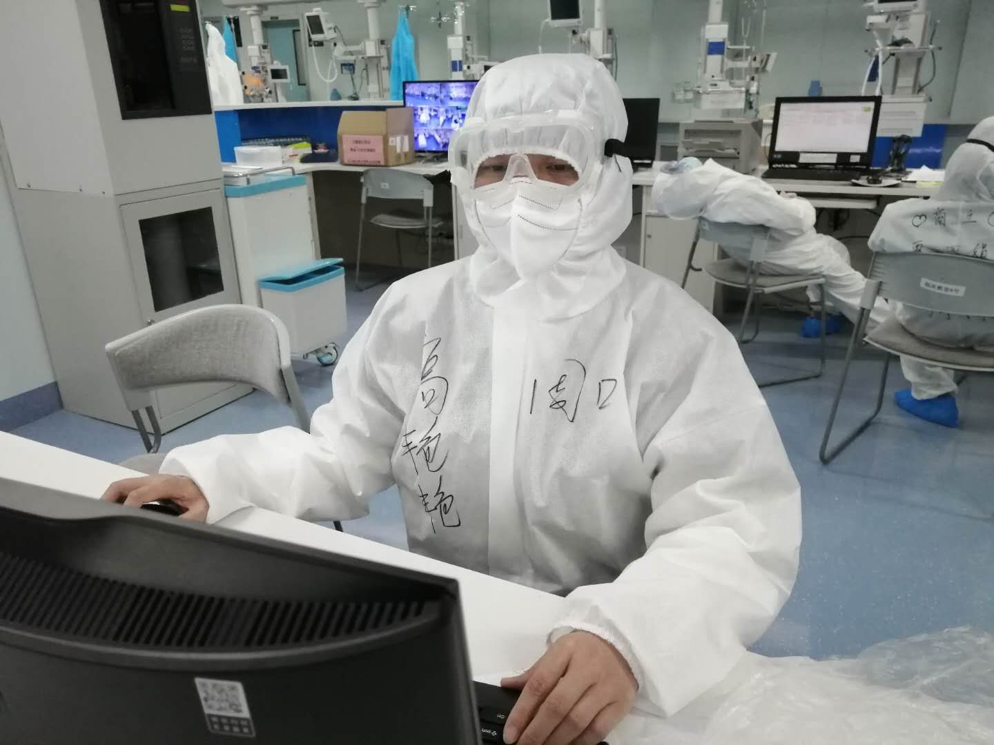 高艷艷說,除了多穿一層防護(hù)服,其他的跟平時(shí)的工作差不多。不同的地方,主要體現(xiàn)為兩點(diǎn),一就是從接班到交班,所做的所有工作都多了一份被感染的風(fēng)險(xiǎn)。二就是救治存在的難點(diǎn)多、棘手的問題多、突發(fā)事件比較多,比如說:新冠肺炎患者發(fā)展到危重期,特別是病程較長(zhǎng)的病人,肺大多爛掉了,多數(shù)病人上有呼吸機(jī),這樣的病人極易出現(xiàn)氣胸。有一次值班期間,一位56歲的男性患者,突發(fā)氧分壓下降、煩躁、血壓下降、出汗,急查胸片證實(shí)氣胸,緊急給予了胸腔穿刺閉式引流,病人癥狀才得以緩解。氣胸雖然在臨床上很常見,但對(duì)于新冠肺炎病人卻如同雪上加霜,不緊急處理病人很快就會(huì)死掉。每一個(gè)搶救的場(chǎng)面如同一場(chǎng)激烈的戰(zhàn)場(chǎng),而戰(zhàn)斗隨時(shí)會(huì)打響,但你卻根本無法預(yù)測(cè)哪一次戰(zhàn)斗會(huì)在哪一個(gè)時(shí)刻打響,所以值班時(shí)每位醫(yī)師都會(huì)慣性地緊盯著每個(gè)數(shù)值、各個(gè)參數(shù)……
