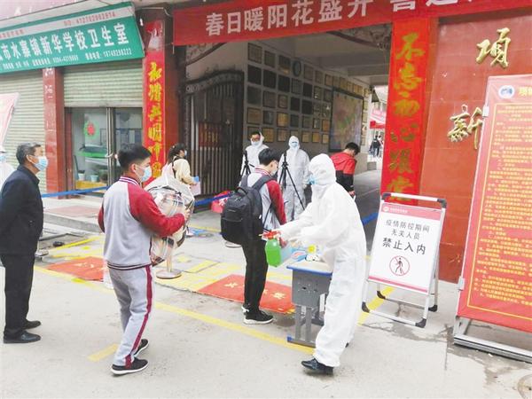 4月20日6時50分,記者在周口四中門口看到,學生們在家長的陪伴下陸續(xù)趕來,按照學校提前下發(fā)的入校流程,在校門口間隔一米距離有序排隊。然后,他們按規(guī)定依次遞交健康承諾表后,在值班教師的引導(dǎo)下,通過大門兩側(cè)設(shè)置的體溫測試通道入校,每個通道處都有工作人員負責引導(dǎo)學生、噴灑消毒液。