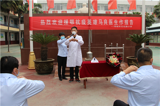為彰顯榜樣力量,傳承抗“疫”精神,5月6日,項(xiàng)城市文化路小學(xué)邀請(qǐng)項(xiàng)城援鄂抗“疫”英雄代表項(xiàng)城市中醫(yī)院脾胃肝膽科護(hù)士馬良來(lái)校為廣大師生作報(bào)告,講述戰(zhàn)“疫”背后的故事,厚植愛(ài)國(guó)主義情懷。