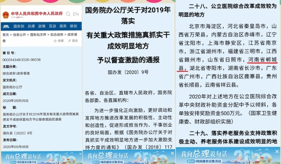 5月8日,中華人民共和國中央人民政府門戶網(wǎng)站發(fā)布《國務(wù)院辦公廳關(guān)于對2019年落實(shí)有關(guān)重大政策措施真抓實(shí)干成效明顯地方予以督查激勵的通報(bào)》國辦發(fā)〔2020〕9號文件,對213個地方予以督查激勵,相應(yīng)采取30項(xiàng)獎勵支持措施。其中,鄲城縣榮登“對公立醫(yī)院綜合改革成效較為明顯的地方”名錄,獲獎500萬元。