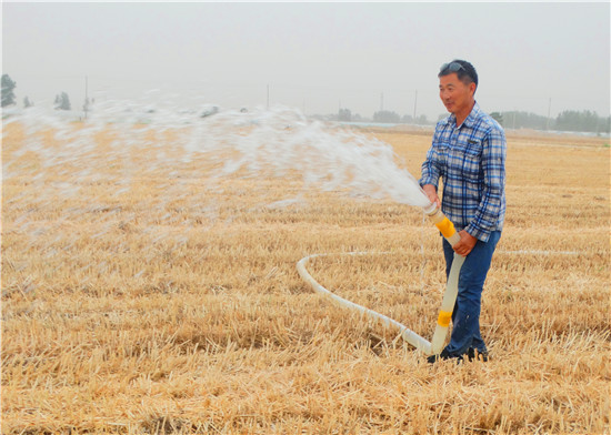 6月6日,沈丘縣周營鎮(zhèn)農(nóng)民正忙著抗旱“造墑”、“補墑”澆水,期待奪取秋糧豐收。 近期來,由于連續(xù)多日高溫?zé)o雨,土壤墑情差,無法播種秋作物。針對當(dāng)下嚴(yán)重的旱情,沈丘縣掀起“雙抗旱”(抗旱保苗、抗旱種秋)高潮。目前,該縣日出動勞力1.8萬余人,出動各類噴灌機械26000多臺(套),力保農(nóng)田播種的玉米出苗。