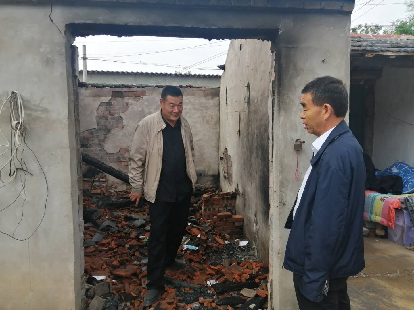 聽完情況后,督導組立刻和駐村工作人員一起到李洪范家查看情況,現(xiàn)場主屋已經(jīng)全部燒毀,屋里到處是瓦礫......李洪范站在被燒毀的房屋里,表情木納的自言自語道“燒得一干二凈,什么都沒了,這以后咋弄呀?!爆F(xiàn)場詢問其生活情況時,李洪范說,“當天,鄉(xiāng)里邊就送來了米、油和錢。村長也送來了幾件衣服,現(xiàn)在就是沒有地方住?!?/p>