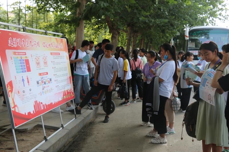 在該縣各標(biāo)準(zhǔn)化高考考點征兵宣傳現(xiàn)場,人頭攢動、熱鬧非凡?!昂媚袃海瑏懋?dāng)兵”大紅條幅和“把忠心獻給祖國,把青春獻給軍營”“參軍報國盡義務(wù),熱血青年競風(fēng)采”的大型宣傳牌格外引人注目,內(nèi)容豐富的征兵宣傳展板一字排開,《征兵宣傳手冊》《大學(xué)新生應(yīng)征入伍宣傳單》《征兵政策宣傳解讀手冊》等征兵宣傳資料擺放在咨詢臺上一目了然,吸引了眾多的考生和家長駐足觀看,圍著咨詢臺詢問有關(guān)征兵事宜。