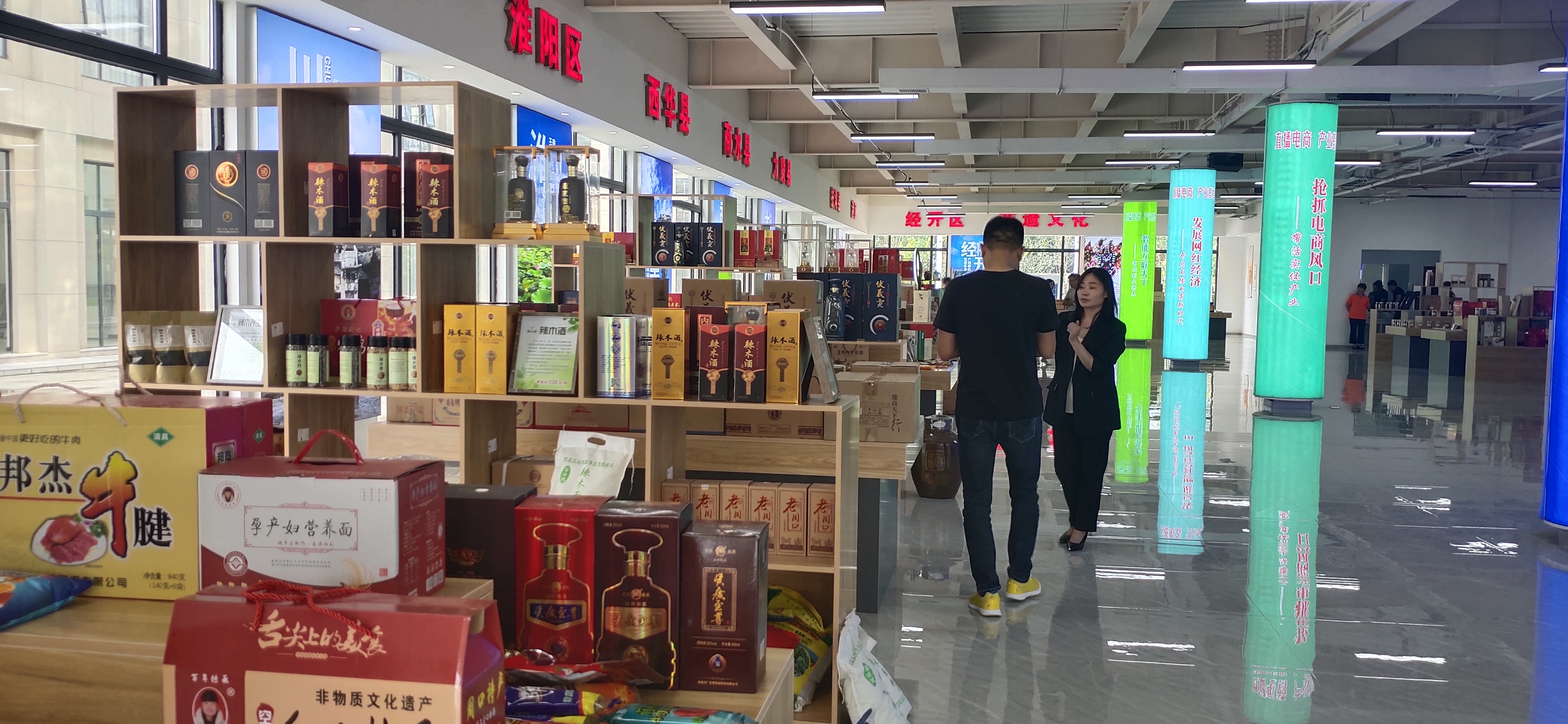 中心展廳面積達(dá)1000多平方米,按照不同縣(市、區(qū))劃分為十幾個(gè)區(qū)域,集中展示邦杰牛肉、伏羲貢酒、鄧城豬蹄、汝陽(yáng)劉毛筆、三川豫龍復(fù)合肥等周口產(chǎn)品。這些產(chǎn)品都是來(lái)自各縣(市、區(qū))等地農(nóng)工副土特產(chǎn)品以及非遺產(chǎn)品?!拔覀儗⑼ㄟ^(guò)抖音、快手等視頻平臺(tái),把這些產(chǎn)品銷往全國(guó)各地?!?該基地負(fù)責(zé)人、周口東方會(huì)展商會(huì)會(huì)長(zhǎng)于海崗說(shuō)。