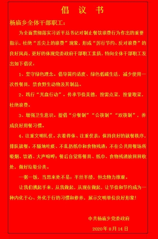 據(jù)楊廟鄉(xiāng)黨委書記聶運(yùn)亨介紹,該鄉(xiāng)積極響應(yīng)總書記號召,向全鄉(xiāng)干部發(fā)出了堅守綠色理念、踐行光盤行動、增強(qiáng)衛(wèi)生意識、注重文明禮儀等四個方面的倡議,讓全鄉(xiāng)干部從我做起,從現(xiàn)在做起,使勤儉節(jié)約成為習(xí)慣和修養(yǎng)。