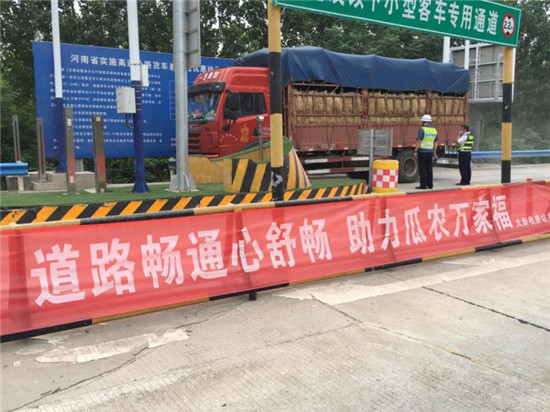 眼下正是瓜果集中上市的季節(jié),為幫助農民銷售富有地方品牌特色的優(yōu)質西瓜,促進當地西瓜經濟的發(fā)展,扶溝縣大新收費站全員出動保暢通,為全國各地拉瓜商販提供便捷服務,為當地出口經濟的發(fā)展貢獻一份力量。