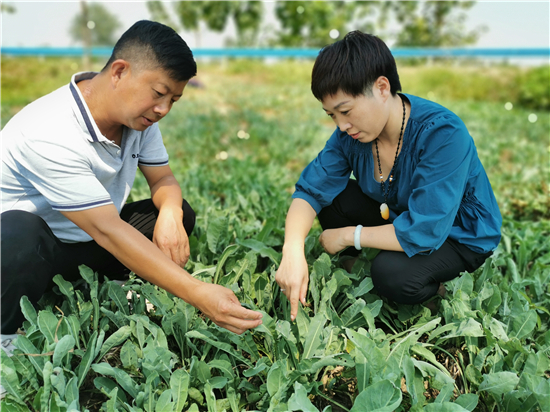 圖為村干部查看板藍(lán)根長(zhǎng)勢(shì)